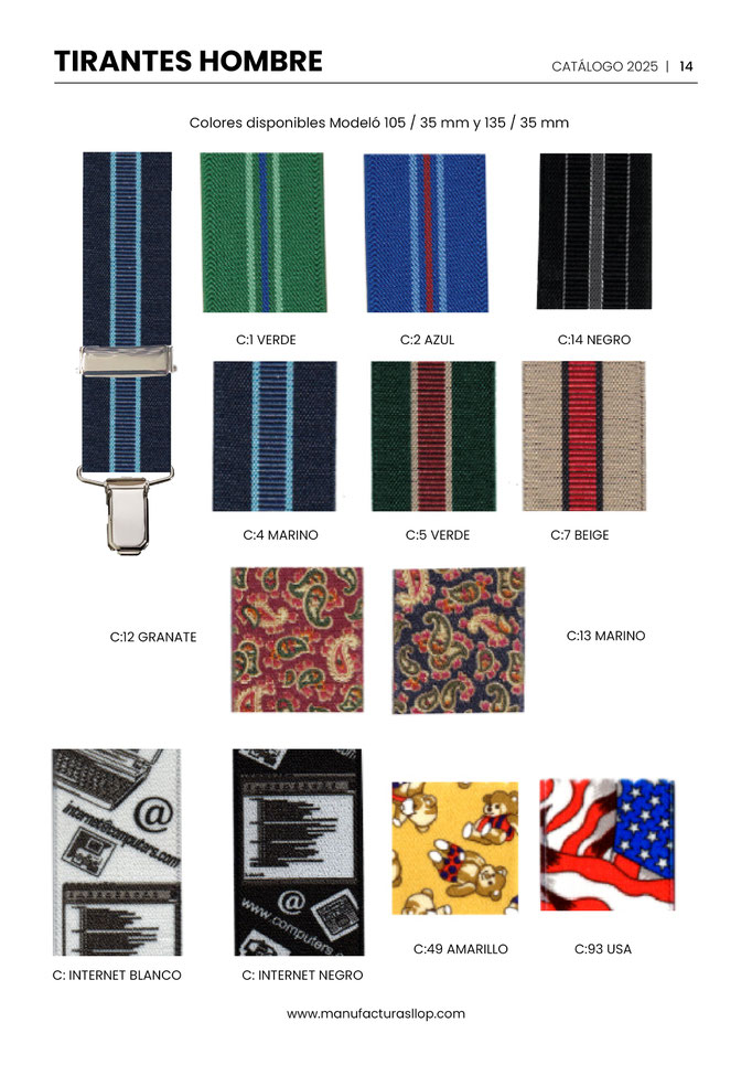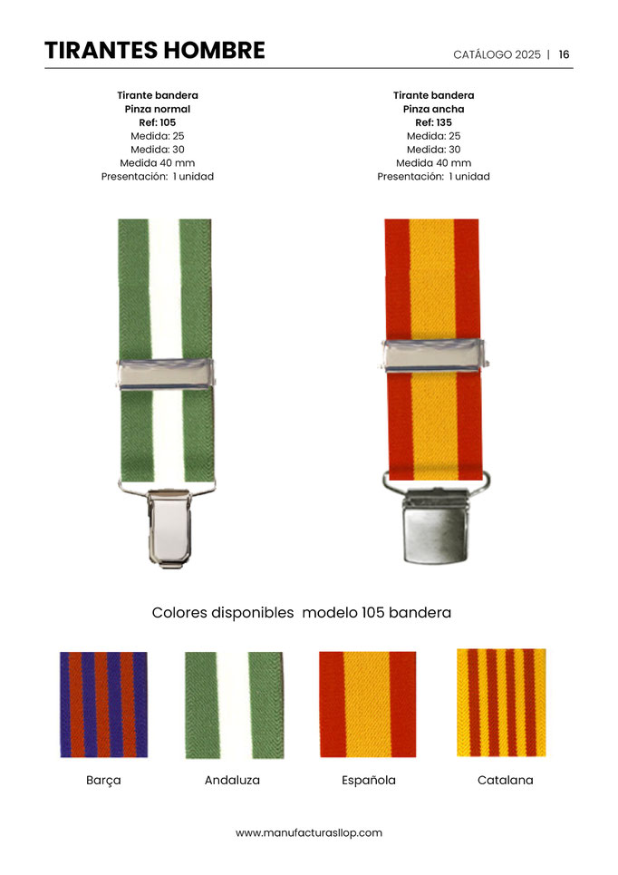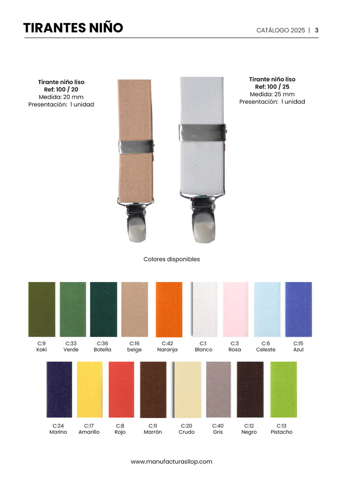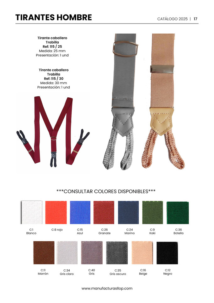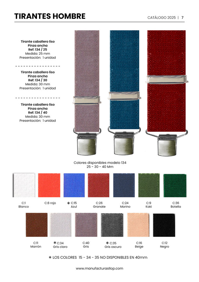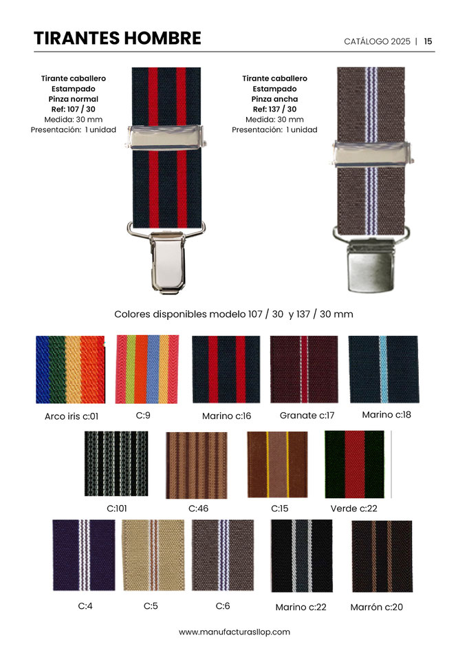 Los tirantes se hacen en 30 y 35 mm ( tirante caballero ) y en 25 mm ( tirante infantil ) sobre goma blanca, habiendo una cara impresa y la otra blanca.