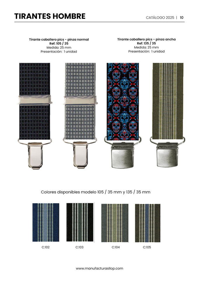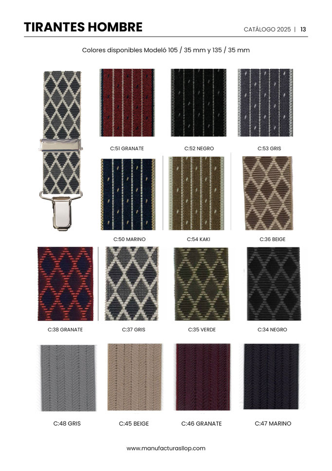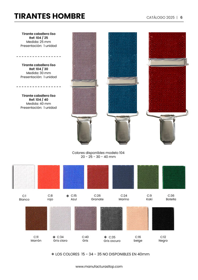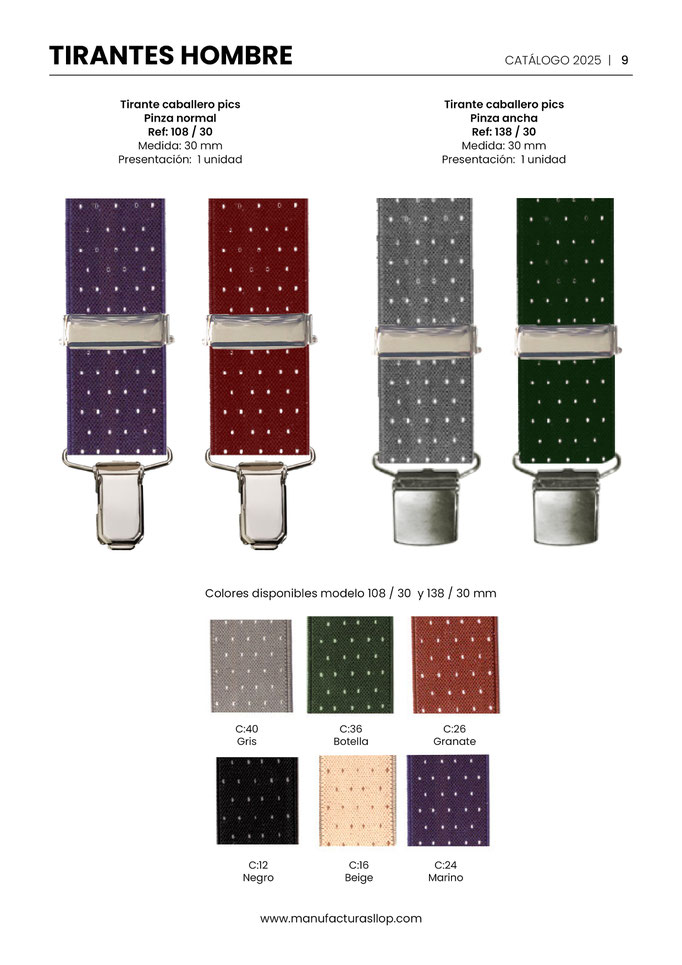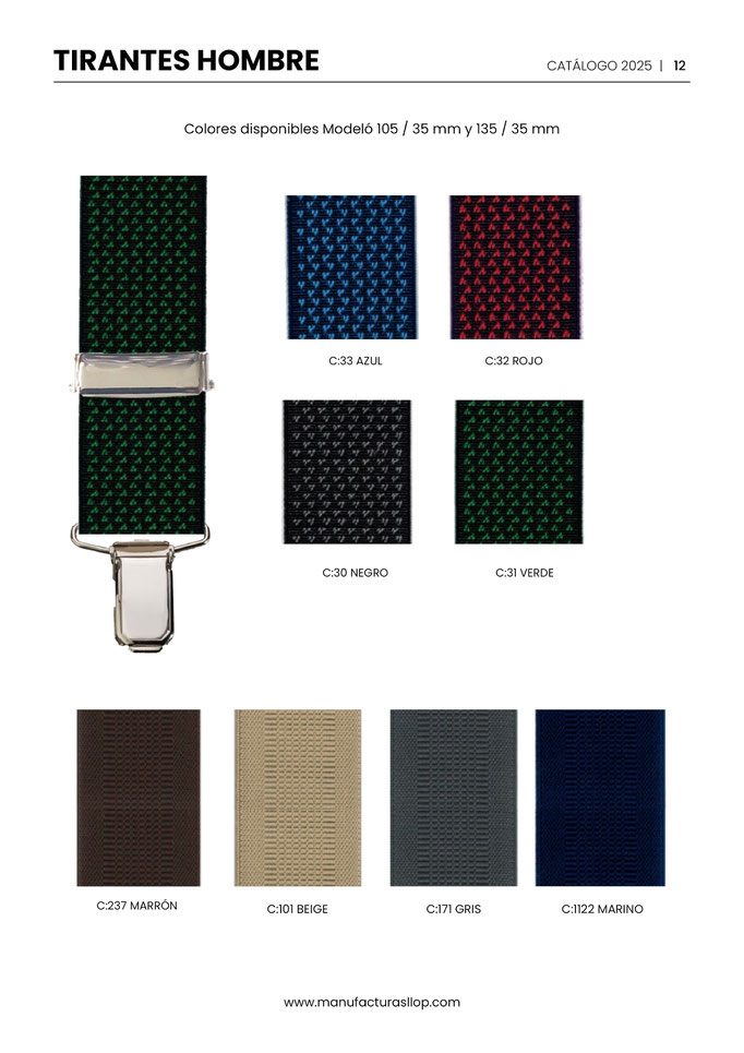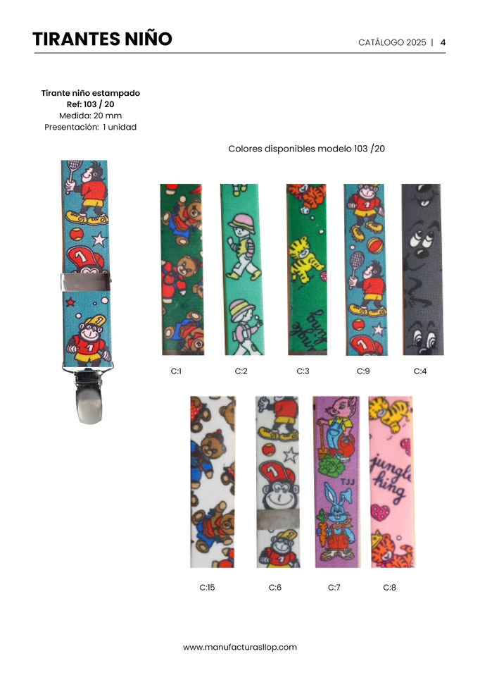 Los tirantes se hacen en 30 y 35 mm ( tirante caballero ) y en 25 mm ( tirante infantil ) sobre goma blanca, habiendo una cara impresa y la otra blanca.